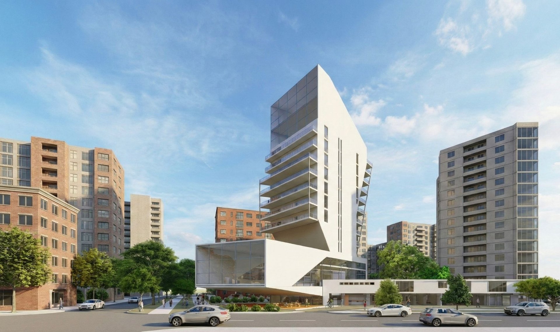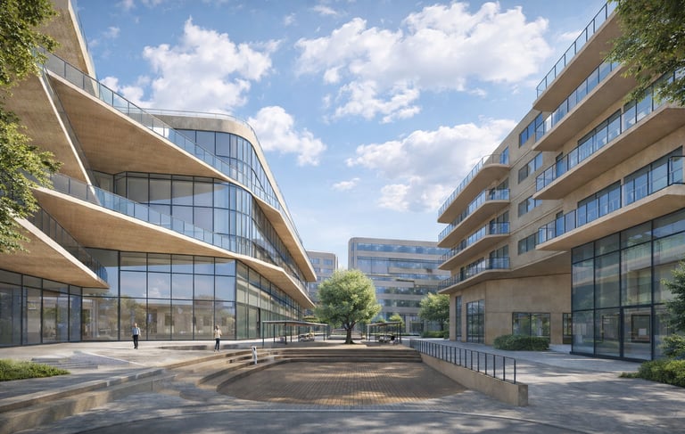 A hybrid building integrates residential and public functions, featuring small housing units with patios and a high-rise building with brutalist elements for families. Additionally, it includes commercial and cultural centers, forming a cohesive composition that blends these diverse elements.
