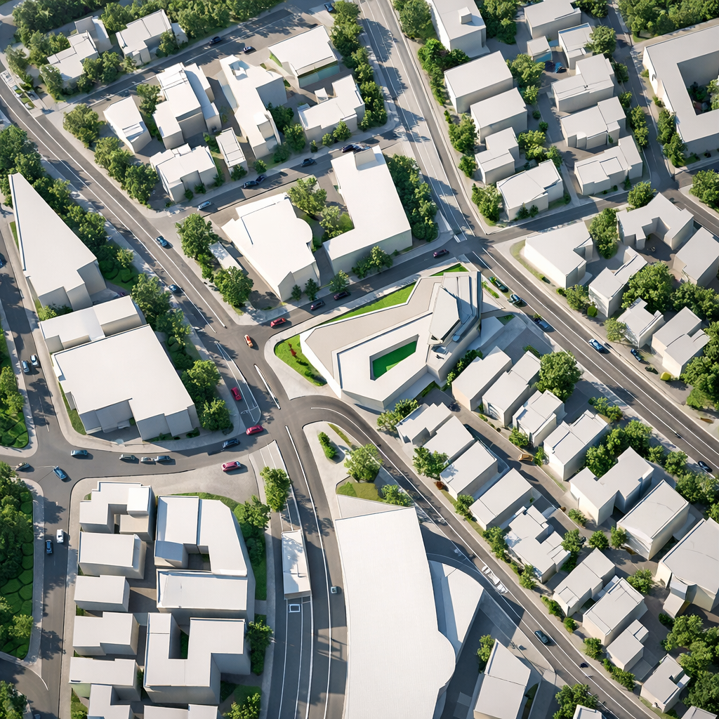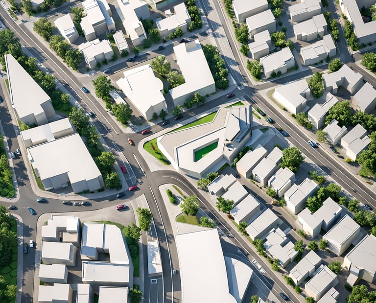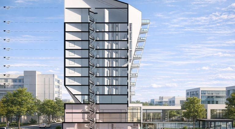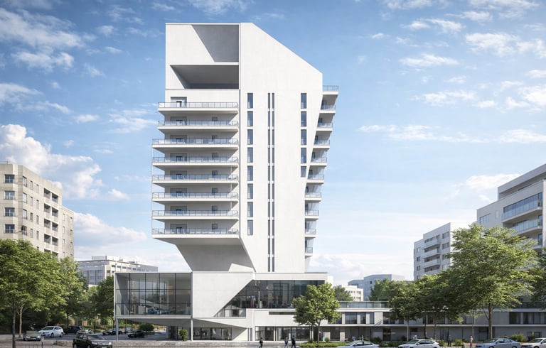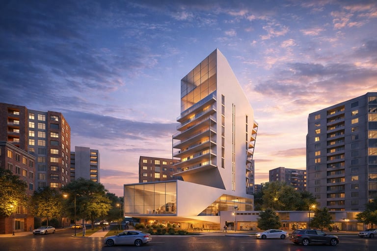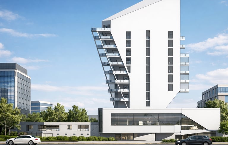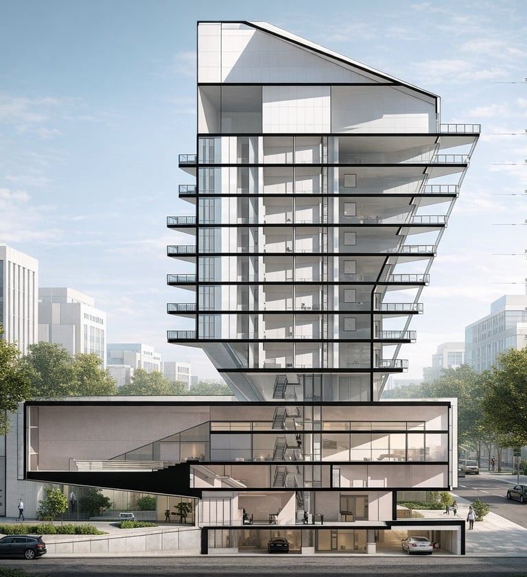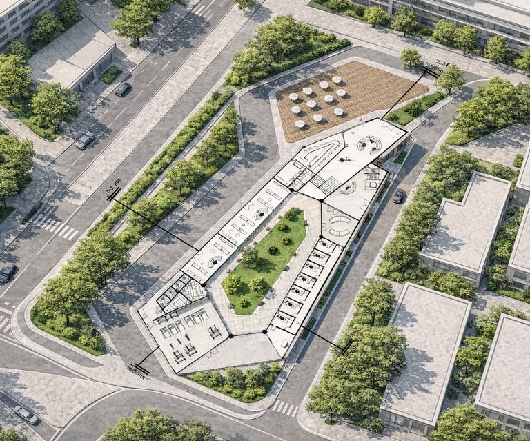 A hybrid building combines two central functions: residential and public. It includes two sections dedicated to residences. One section features small housing units with a patio, while the other is designed as a multi-story building with brutalist touches, housing families. Additionally, the building comprises two other sections that combine trade and cultural centers. These functions and their integration into a single entity create a composition that expresses the union of these two elements.