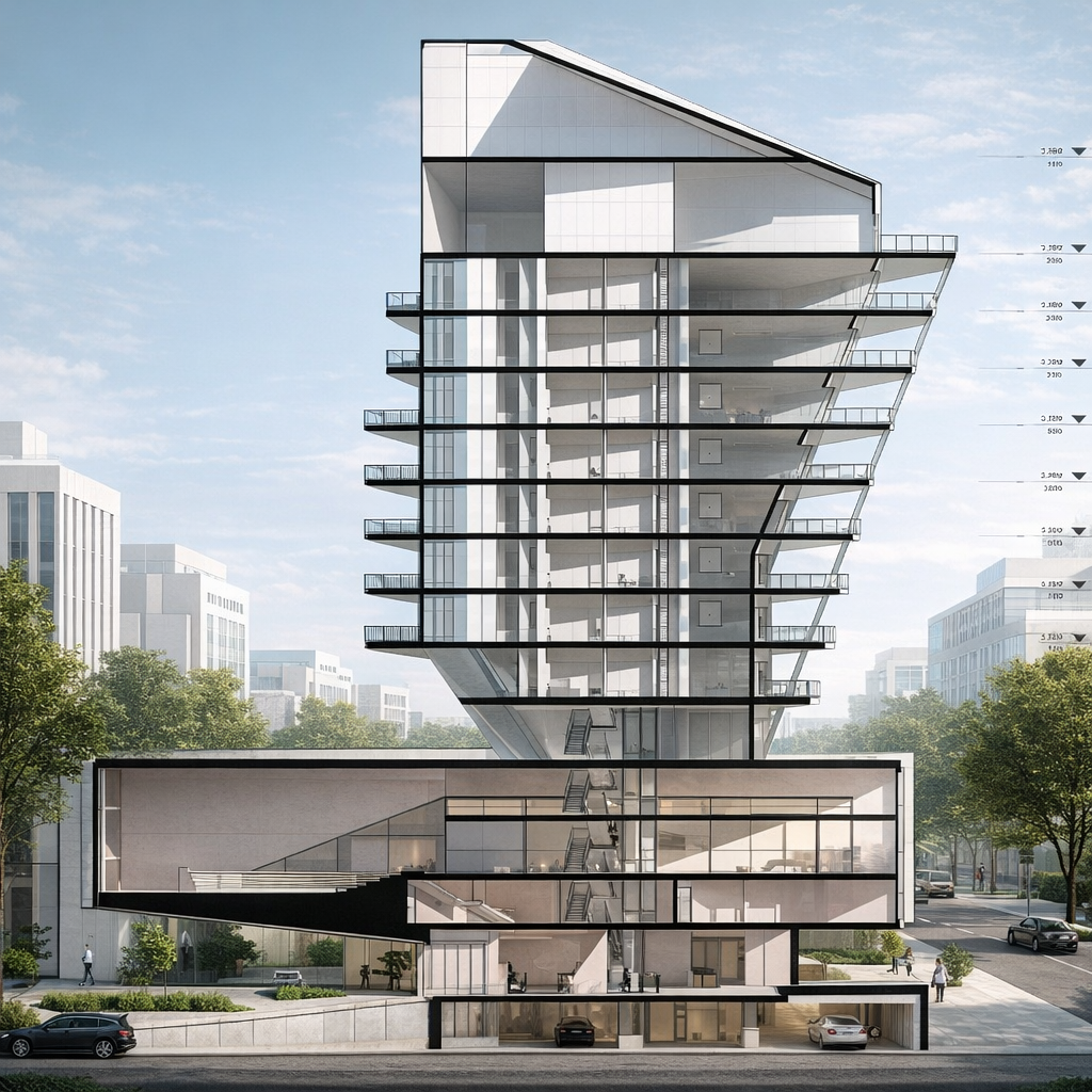 The ground floor level includes a lobby for the building's residents in the eastern area, along with workspaces that can serve both the public and the residents. There is also a commercial space, a gym, and a private garden for the residents.