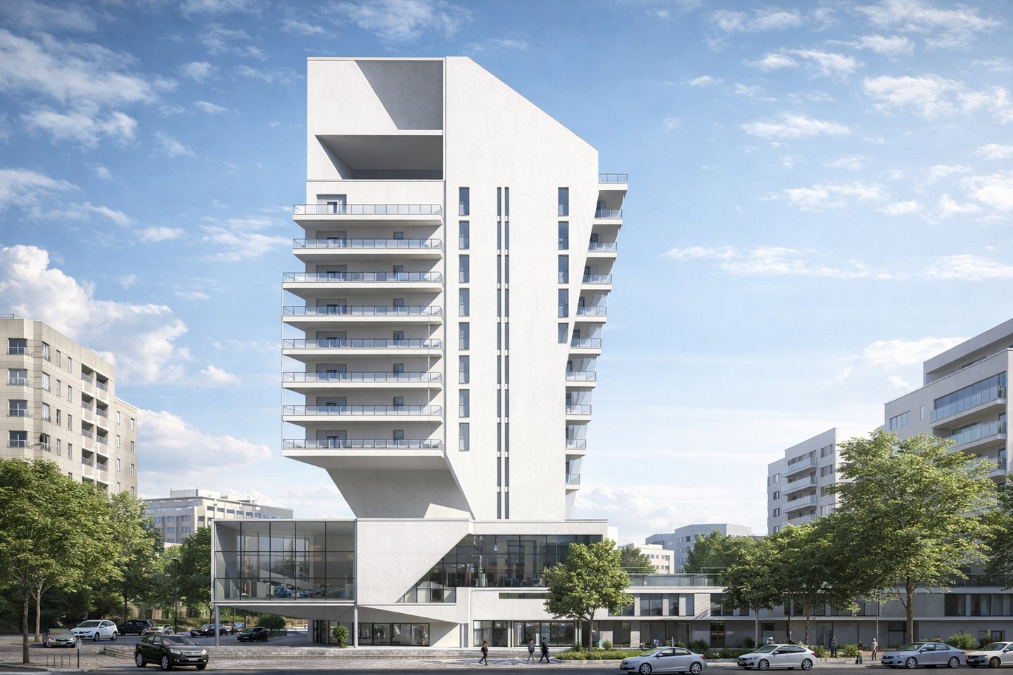The facades showcase the modern Brutalist style of the building's white shell structure, featuring large, interlocking masses.